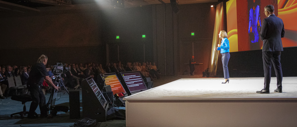Laura: The details people tend to overlook are the ones that often matter most. We talk early about microphone type — whether a lavalier or headset mic is best — and how that affects wardrobe choices. When we have the stage plot and know where the presenter will stand in relation to the display, we review what content will appear behind presenters on the screen, so they don’t blend into the background. We also walk through speaker bumpers, videos and cues so nothing feels unfamiliar. When presenters know what to expect, rehearsals move faster and the overall show runs more smoothly.
