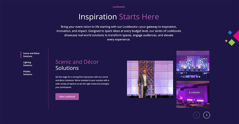 Once you’ve narrowed down your choices, visit our Lookbook Portal to see the different ways the Encore team can bring them to life. These lookbooks for scenic and décor, lighting and display solutions showcase real-world illustrations of how we work with you to transform spaces, engage audiences and elevate the event experience.