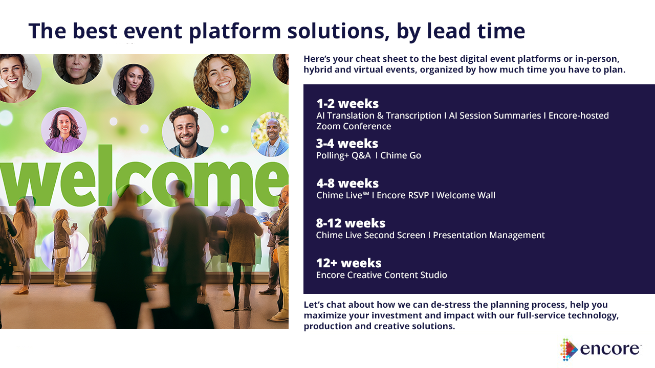 Let’s create a hybrid experience that blends the in-person and digital worlds with Chime Live℠, a powerful digital storytelling platform that makes your guests feel special. The Encore team can help you maximize value by using it: